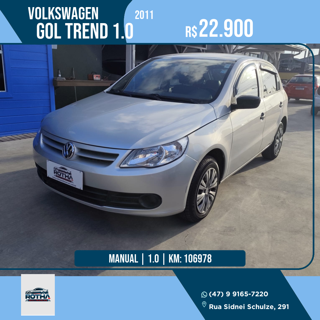 Gol Trend 1.0 2011 - ABAIXO DA FIPE! 🚨 Para vender rápido! Vendo meu Volkswagen Gol Trend 1.0 (G5) 2011, carro extremamente econômico e com manutenção barata. Ideal para quem busca um veículo para o dia a dia ou trabalho. [1] • Modelo: Trend 1.0 Mi Total Flex 8V 4P • Ano: 2011/2011 • Destaques: Motor EA-111, 4 portas, interior bem conservado. • Diferencial: Preço abaixo da Tabela Fipe! • Tabela Fipe: R$ 25.066 Documentação em dia, pronto para transferir. Não aceito trocas, valor para venda imediata. - Aceitamos seu veículo ou motocicleta usado na troca - Financiamos até 60x por diversos bancos - Parcelamento no cartão de crédito até 18x com taxas super reduzidas